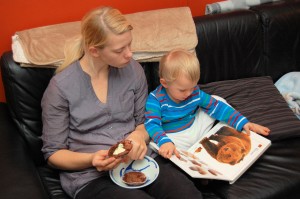 Sen blev det lugnare igen. Felix satte sig med mig i soffan och läste en bok medan jag åt muffins som mormor/farmor o Elvira bakat idag..