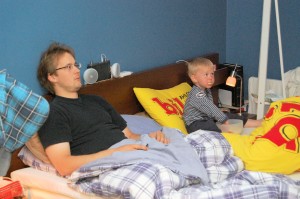 Dagen efter var rätt slapp för sambon. Han var sängsittande hela dagen. Detta gillade Felix och jag. Felix satt och tittade film med pappa i sängen nästan hela dagen och åt majskrokar mm. 😛 Kolla så full munnen är.. Hihi