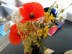 På midsommar förmiddag åkte jag och Felix till mormor för lite minimys. Felix sa på vägen dit att vi behövde ha blommor till mormor för hon gillar blommor. Så vi stannade vid vägkanten och plockade lite fina midsommarblommor. Hon blev så glad för blommisarna.