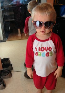 Här är Felix i pappas solisar, och bakom honom finns spegeln där han pillade in sitt kort så det inte går att få ut.. Borta med andra ord.. Därav den något sura minen.. :-S Men vi mös massvis.. Vi gick i pyjamas till efter middagssömnen, sen for vi på möte, handlade lite och sen var det på med pyjamasen igen.. Hehe..