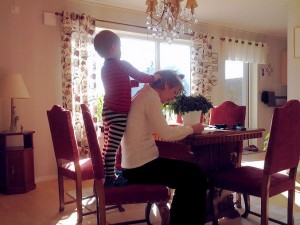 Efter pusskalaset började Felix sätta upp mormors hår med min hårsnodd.