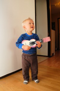 Felix fick syn på en minigitarr och ville köpa den för 10:- Nu skulle han bara stämma den så han kunde spela musik för pappa när vi kom hem.
