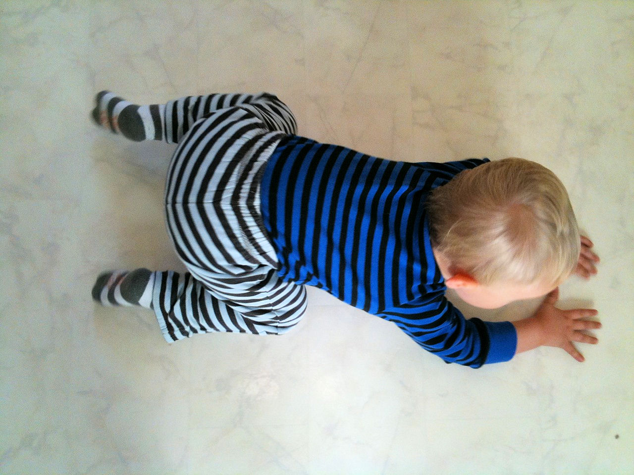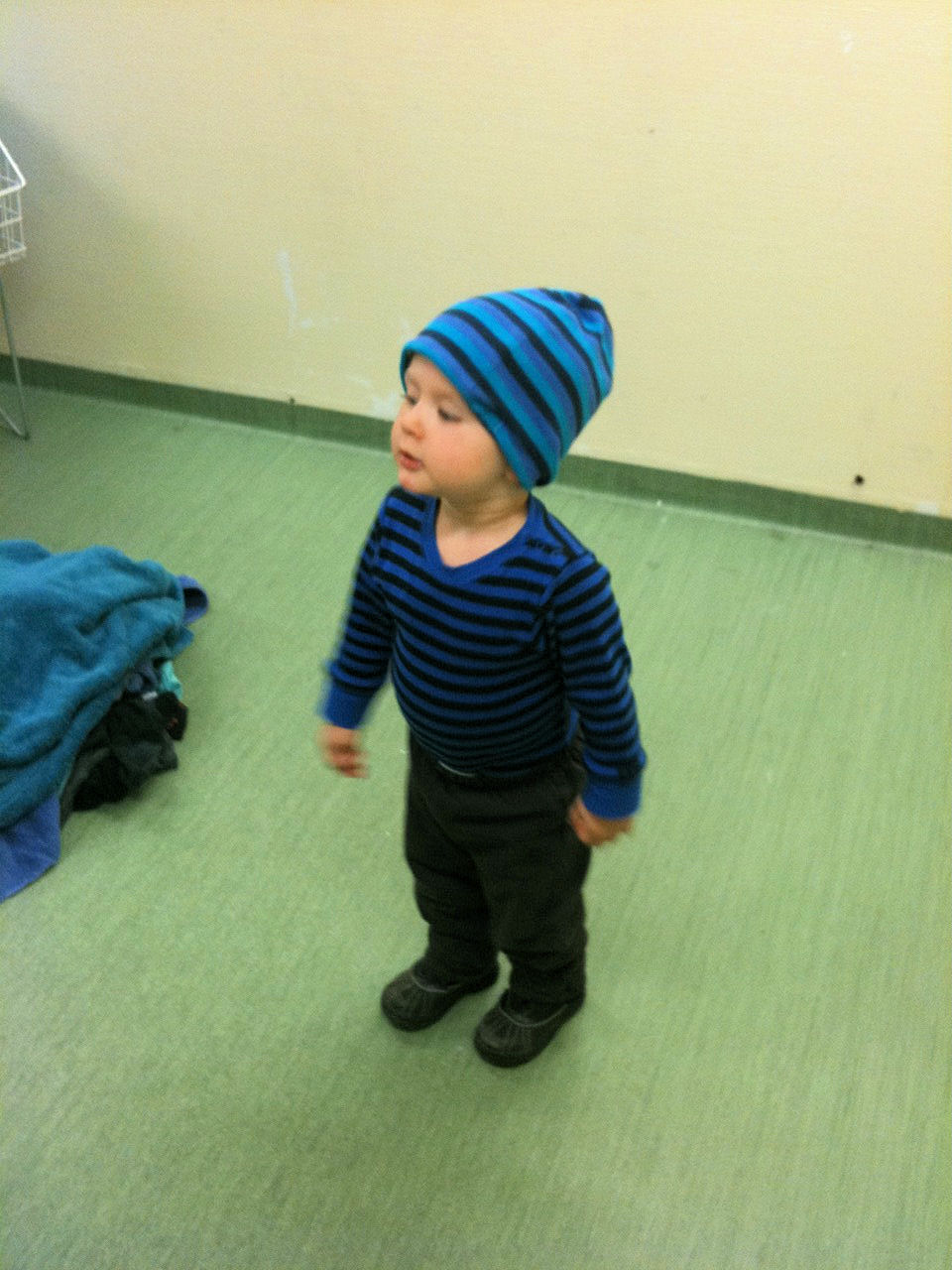Totalt randig bebis.. Han har en randig mössa med.. (inte med på bild så klart)