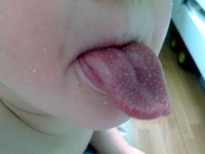 Jepp Felix åkte på denna udda sjukdom. Han påverkades inte så mycket men detta var ett tecken på det. Smultrontunga!