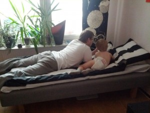 Det blev en del mys hemma med. Pappa och Felix gillar att slappa i pappas säng med pappas telefon. Jag får oftast inte vara med. 🙁 Men det ser mysigt ut. Jag får klappa på tösen i magen istället..