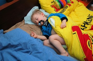 Felix är så söt när han sover middag.. Detta är i vår otroligt matchande säng.. 🙂