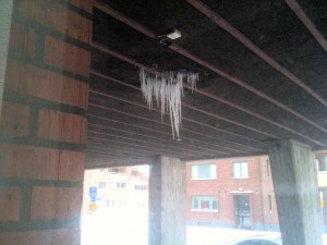 För lite mer än en vecka sen ungefär såg jag detta ifrån tvättrummets fönster.. Det är typ 20 st istappar som hänger ner från taket på gångtunneln över till campus. De kommer från rören som går under vårt vardagsrum. De har gått sönder förr men nu är det istappar på 3 dm var som hänger där mitt ovanför gångbanan.. Jag fick anmäla det till Akelius så de kan komma o ta bort det men jag tror faktiskt inte de lägger så mycket vikt i det tyvärr.. Hoppas de rasar på natten när ingen går där så ingen blir skadad..